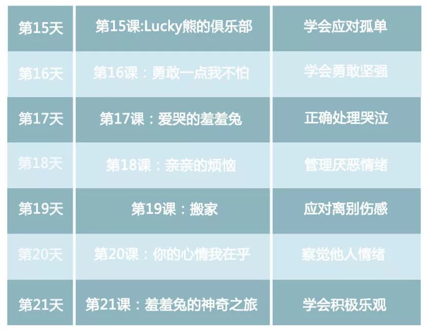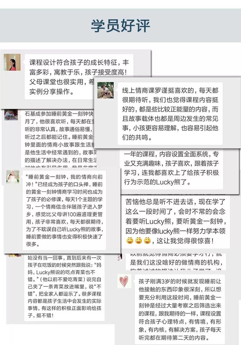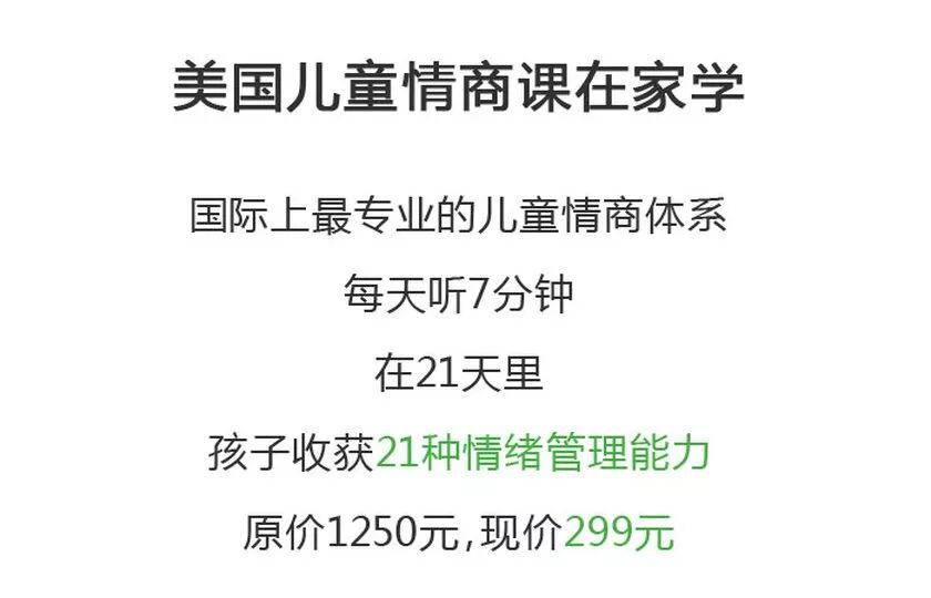 点击上图购买 凡参与订阅美国儿童情商课—情绪宝贝21天计划课程,均有机会获得Lucky熊好运抱枕一个! 活动详情 抽奖流程: 1.识别二维码,“关注”公众平台; 2.输入“情绪”二字,获取抽奖链接; 3.进入抽奖。 中国第一个美国精英式情商培育基地 关注孩子情商教育,做合格的父母 美国儿童情商MBA课 儿童情商,终身受益 中国唯一拥有国际少儿情商证书的品牌